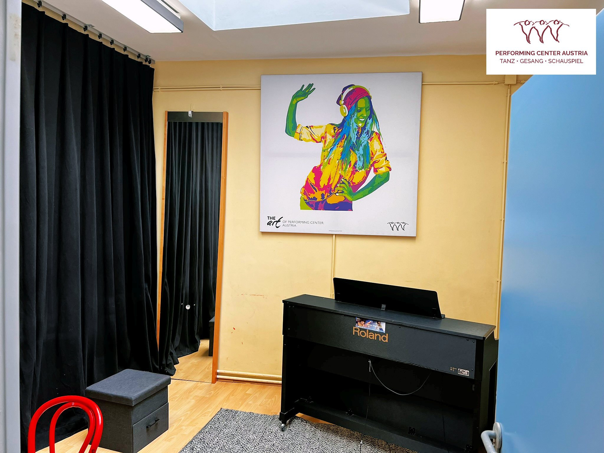Ein besonderes Merkmal ist der schwarze Vorhang vor einer Wand, der dem Raum eine klare Struktur und eine intime Stimmung verleiht. Zudem verfügt Gesangsstudio C gleich über zwei Musikinstrumente – ein Pianino und ein Digital Piano Yamaha – und eröffnet dadurch zusätzliche Möglichkeiten für die musikalische Arbeit.