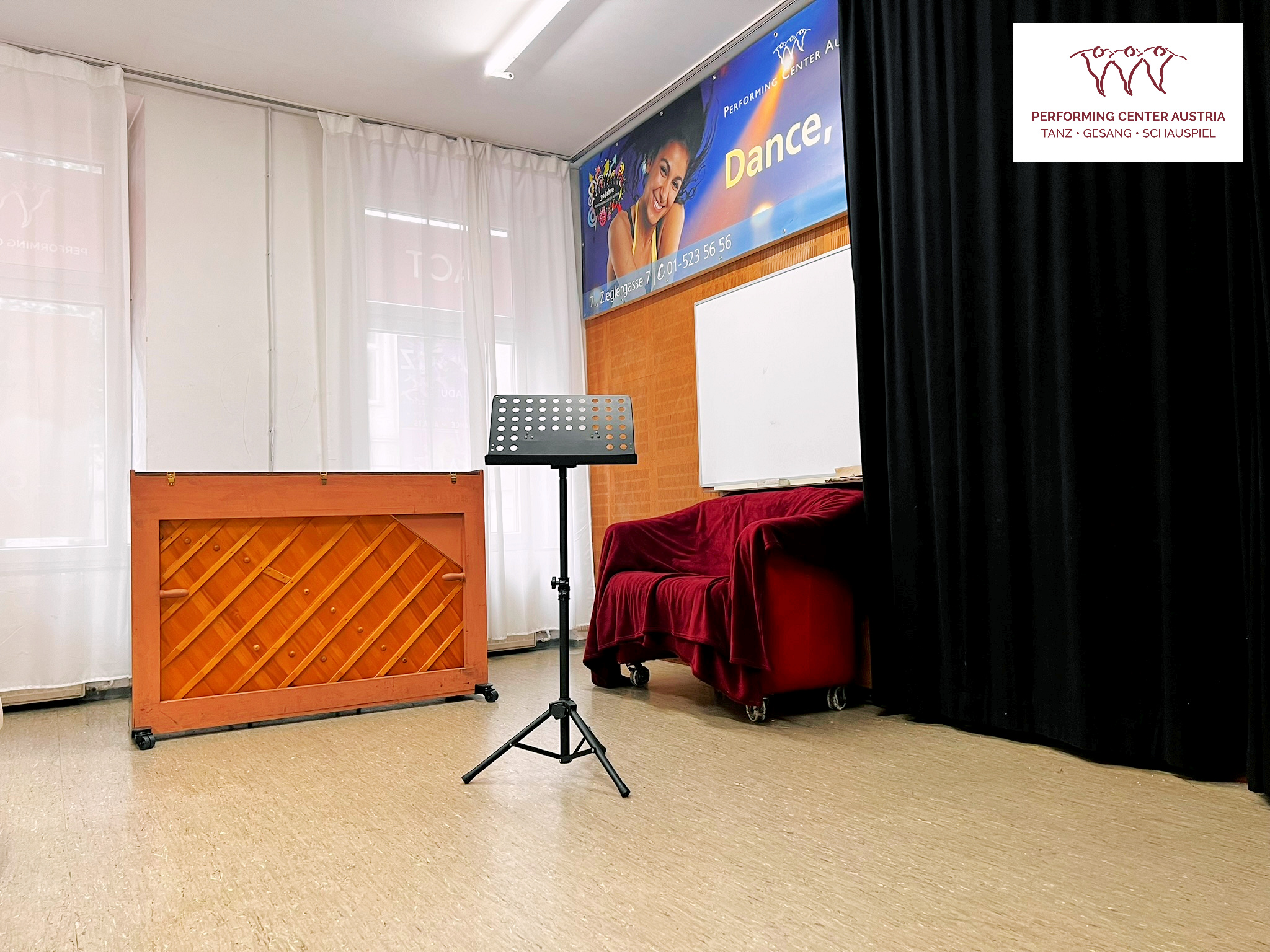 Mit 27 m² bietet Gesangsstudio A ideale Bedingungen nicht nur für den Einzelgesang, sondern auch für kleine Gesangsensembles oder musiktheoretische Fächer hervorragend geeignet. Dank seiner Lage unmittelbar beim Tor zum Performing Center Austria ist es besonders zentral und gut erreichbar. Die beiden großen Fenster zur Zieglergasse verleihen dem Raum ein freundliches Ambiente.